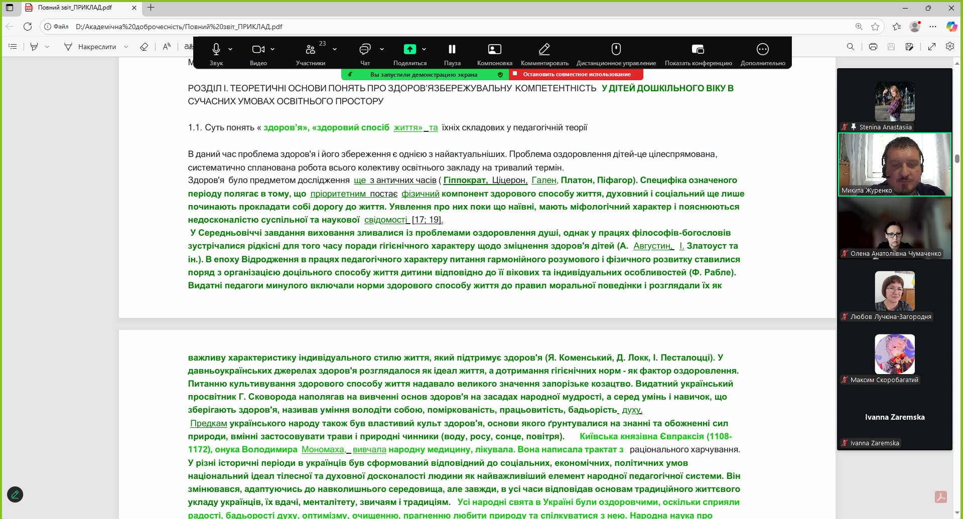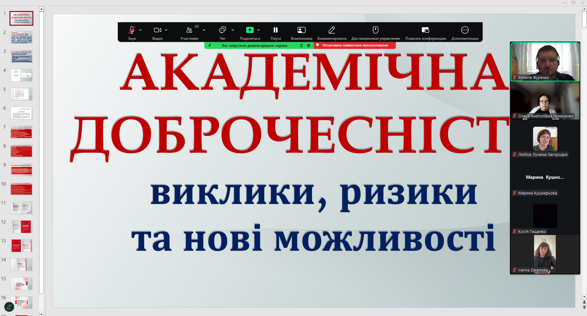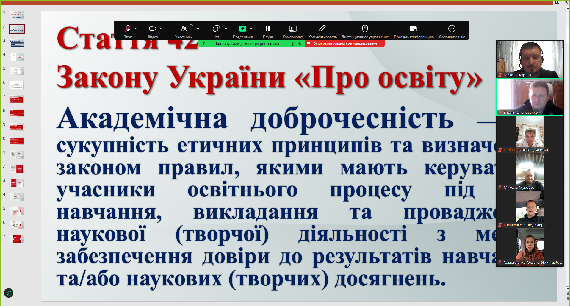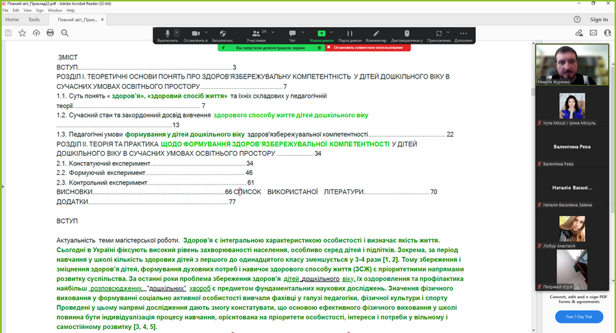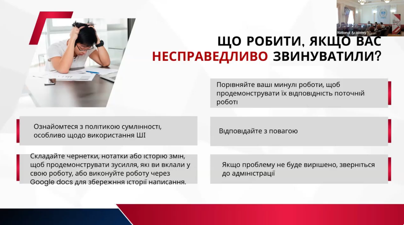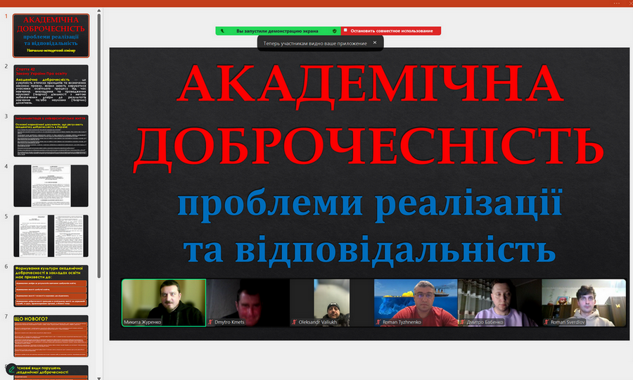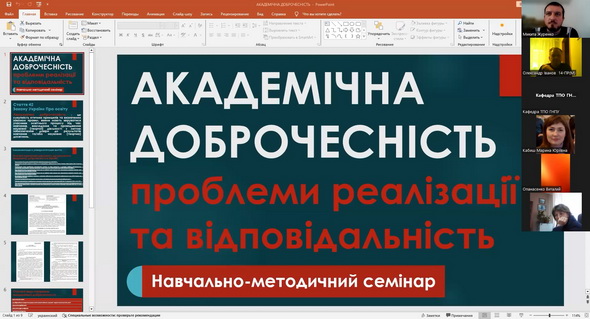 11) 29 жовтня 2024 року адміністратором антиплагіатного сервісу StrikePlagiarism та програми Anti-Plagiarism Микитою Журенком для здобувачів вищої освіти та науково-педагогічних працівників факультетів технологічної і професійної освіти, дошкільної освіти та навчально-наукового інституту педагогіки і психології було організовано та проведено навчально-методичний семінар на тему "Академічна доброчесність: проблеми реалізації та відповідальність". У ході заходу учасники мали змогу детально ознайомитися з чинною нормативно-правовою базою України, яка визначає засади забезпечення академічної доброчесності в системі освіти та науковій сфері. Особливий акцент було зроблено на питаннях відповідальності за порушення принципів академічної доброчесності. Обговорювалися як перспективи використання технологій штучного інтелекту для підвищення якості освітнього процесу й дослідницької роботи, так і ризики, пов’язані з можливими порушеннями академічної етики, зокрема в контексті самостійності виконання завдань, достовірності результатів і авторства. Під час семінару було проаналізовано критерії та вимоги перевірки кваліфікаційних робіт освітніх ступенів "Бакалавр" і "Магістр" щодо виявлення текстових запозичень, розглянуто звіти подібності з антиплагіатного сервісу StrikePlagiarism та програми Anti-Plagiarism. Учасники семінару активно долучилися до обговорення проблемних питань, пов’язаних із забезпеченням академічної доброчесності, зокрема в контексті цифровізації освіти та зростання обсягів цифрового контенту. Захід сприяв підвищенню обізнаності учасників щодо практичних аспектів дотримання академічної доброчесності, формуванню відповідального ставлення до академічного письма та розвитку навичок критичного аналізу наукових текстів.