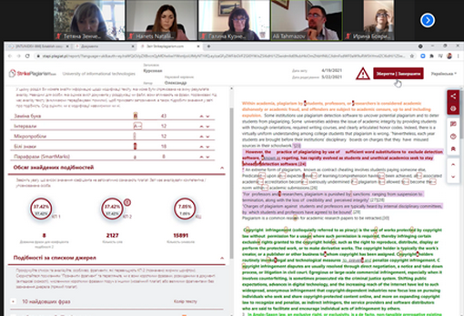3) 24 травня 2021 року відбулася зустріч адміністрації Глухівського національного педагогічного університету імені Олександра Довженка, гарантів освітніх наукових програм підготовки доктора філософії "Теорія і методика вищої освіти" Віри Курок, "Теорія і методика професійної освіти" Василя Ковальчука, адміністратора антиплагіатного сервісу StrikePlagiarism Микити Журенка з виконавчим директором компанії Plagiat.pl Алі Тахмазовим та менеджером з бізнес розвитку по Україні Наталією Ганець. Керівництво Plagiat.pl провело презентацію нових функціональних можливостей антиплагіатного сервісу StrikePlagiarism. Було обговорено умови укладення нового контракту та досягнена домовленість про продовження співпраці в області забезпечення дотримання принципів академічної доброчесності. Означеною програмою буде продовжено моніторинг якості кваліфікаційних робіт освітніх ступенів "Бакалавр" і "Магістр" та дисертаційних досліджень наукового ступіня "Доктор філософії".