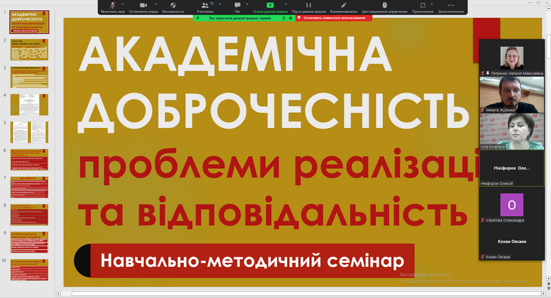 9) 2 грудня 2023 року адміністратором антиплагіатного сервісу StrikePlagiarism та програми Anti-Plagiarism Микитою Журенком для здобувачів вищої освіти та науково-педагогічних працівників навчально-наукового інституту педагогіки і психології було організовано та проведено навчально-методичний семінар на тему "Академічна доброчесність: виклики та проблеми сучасності". У ході заходу учасники ознайомилися з актуальною нормативно-правовою базою України, що регламентує дотримання принципів академічної доброчесності в освітньому та науковому середовищі. Окрему увагу було приділено сучасним викликам, пов’язаним із використанням штучного інтелекту в освітньому процесі й наукових дослідженнях, а також його потенційному впливу на порушення академічної етики. Під час семінару було проаналізовано критерії та вимоги перевірки кваліфікаційних робіт освітніх ступенів "Бакалавр" і "Магістр" щодо виявлення текстових запозичень, розглянуто звіти подібності з антиплагіатного сервісу StrikePlagiarism та програми Anti-Plagiarism. Учасники семінару активно долучилися до обговорення проблемних питань, пов’язаних із забезпеченням академічної доброчесності, зокрема в контексті цифровізації освіти та зростання обсягів цифрового контенту. Захід сприяв підвищенню обізнаності учасників щодо практичних аспектів дотримання академічної доброчесності, формуванню відповідального ставлення до академічного письма та розвитку навичок критичного аналізу наукових текстів.