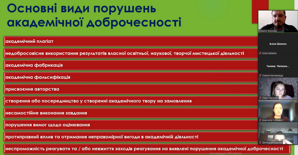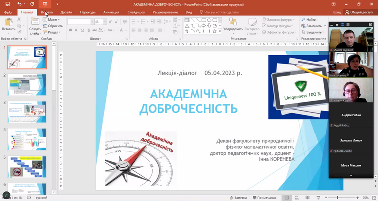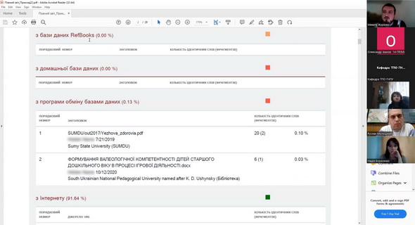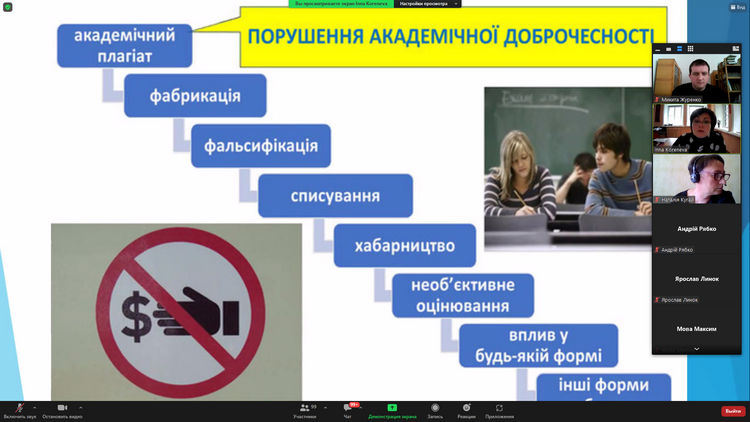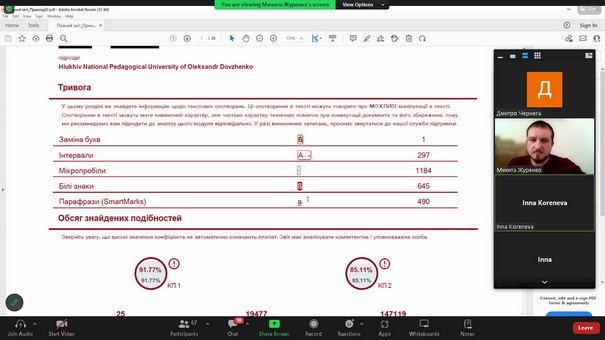 5) 5 квітня 2023 року за ініціативи декана факультету природничої і фізико-математичної освіти Інни Коренової та адміністратора антиплагіатного сервісу StrikePlagiarism Микити Журенка для здобувачів вищої освіти та науково-педагогічних працівників було організовано й проведено лекцію-діалог на тему "Академічна доброчесність". У ході заходу було розглянуто нормативно-правову базу України, що регулює питання авторського права та академічної доброчесності, окреслено критерії та вимоги до перевірки кваліфікаційних робіт освітніх ступенів "Бакалавр" і "Магістр" на предмет наявності текстових запозичень, проаналізовано звіти подібності з антиплагіатного сервісу StrikePlagiarism. Особливу увагу було приділено обговоренню проблемних питань, порушених учасниками зустрічі.