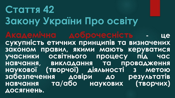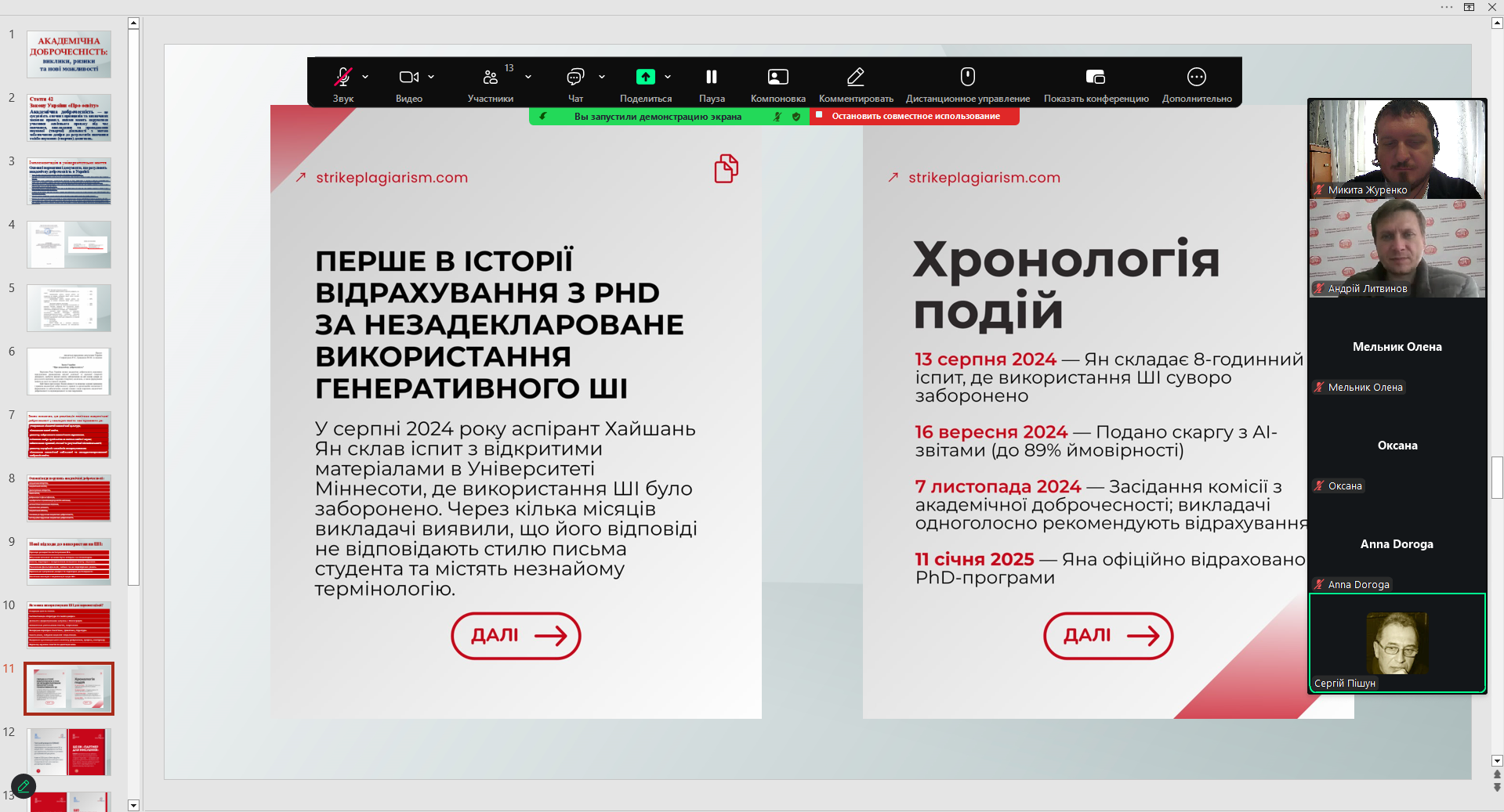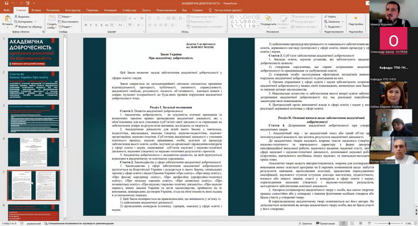 12) 21 листопада 2024 року адміністратором антиплагіатного сервісу StrikePlagiarism Микитою Журенком для здобувачів освіти третього (освітньо-наукового) рівня вищої освіти було організовано та проведено навчально-методичний семінар на тему "Академічна доброчесність: проблеми реалізації та відповідальність". У ході заходу учасники мали змогу детально ознайомитися з чинною нормативно-правовою базою України, яка визначає засади забезпечення академічної доброчесності в системі освіти та науковій сфері. Обговорювали як потенціал штучного інтелекту для підвищення якості освіти й досліджень, так і ризики порушення академічної етики — зокрема щодо самостійності, достовірності та авторства. Під час семінару було проаналізовано критерії та вимоги перевірки наукових текстів на дотримання принципів академічної доброчесності, розглянуто звіт подібності з антиплагіатного сервісу StrikePlagiarism. Учасники семінару активно долучилися до обговорення проблемних питань, пов’язаних із забезпеченням академічної доброчесності, зокрема в контексті цифровізації освіти та зростання обсягів цифрового контенту. Захід сприяв підвищенню обізнаності учасників щодо практичних аспектів дотримання академічної доброчесності, формуванню відповідального ставлення до академічного письма та розвитку навичок критичного аналізу наукових текстів.