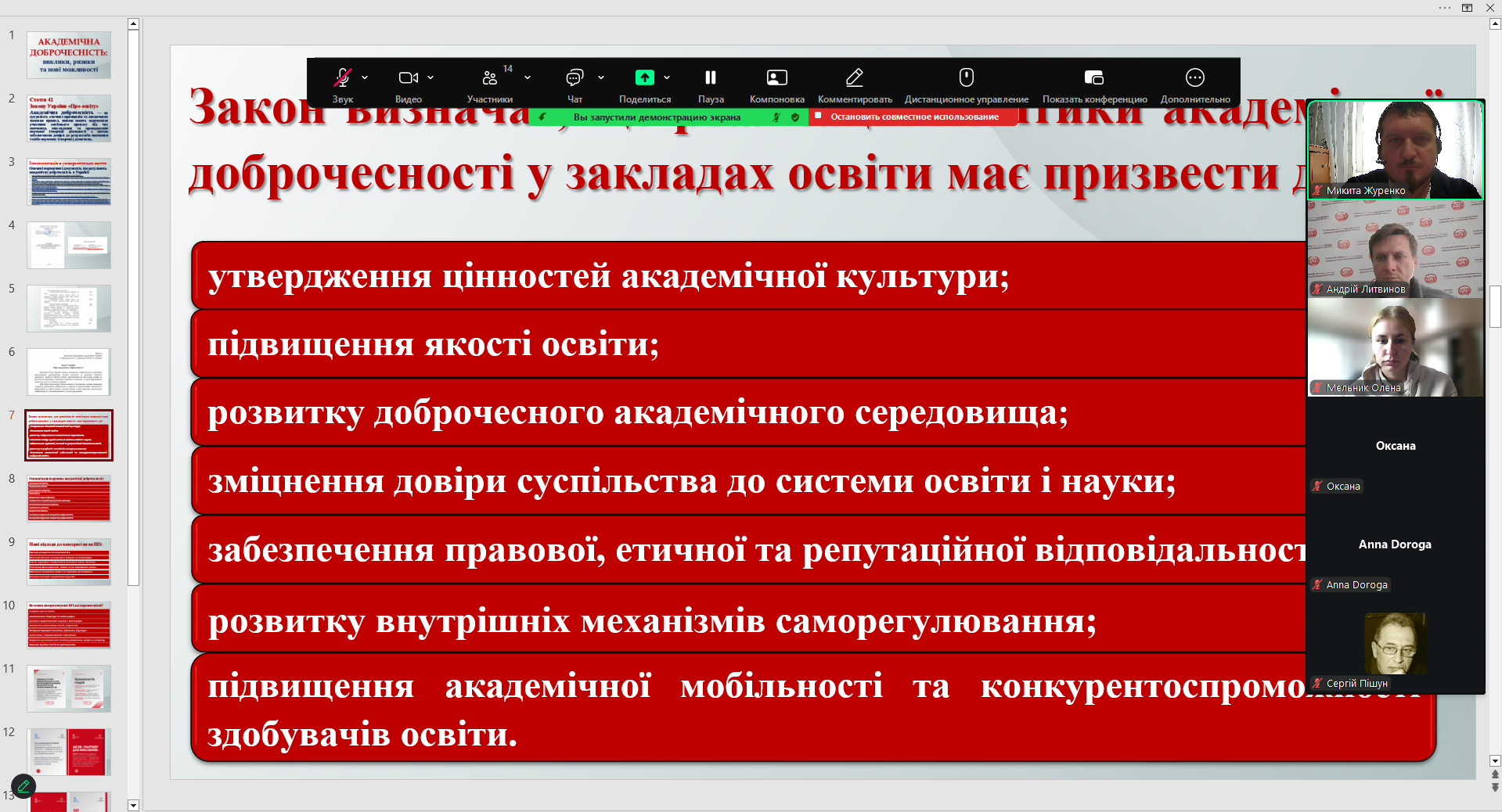 14) 27 серпня 2025 року здобувачі освіти, педагогічні та науково-педагогічні працівники Глухівського національного педагогічного університету імені Олександра Довженка взяли участь у вебінарі "Академічна доброчесність та етика наукових досліджень в епоху відкритої науки", організованому Державною науково-технічною бібліотекою України. Захід було присвячено актуальній темі, що має важливе значення для сучасного науково-освітнього простору. У межах вебінару акцентовано увагу на етичних засадах наукової діяльності, розкрито значення академічної доброчесності для забезпечення якості освітніх і наукових результатів, а також визначено основні виклики, з якими стикаються дослідники в умовах цифрової трансформації суспільства. Участь представників університету у цьому заході сприяла розширенню їхніх науково-методологічних знань, формуванню критичного ставлення до наукових практик та усвідомленню необхідності дотримання етичних норм у навчальній і професійній діяльності.