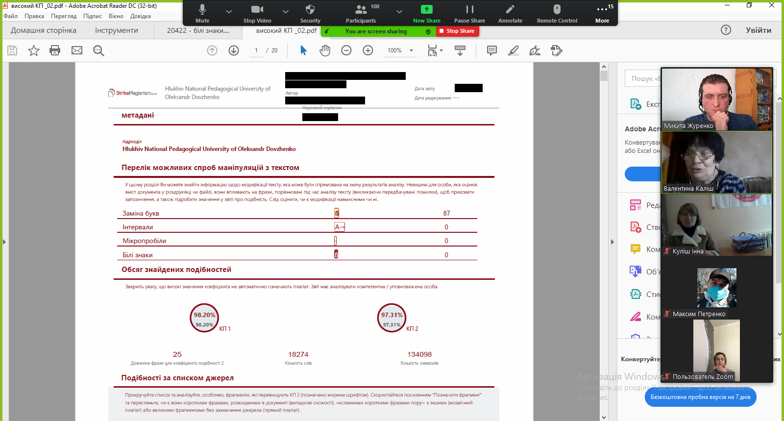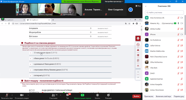 19) 30 жовтня 2025 року представники Глухівського національного педагогічного університету імені Олександра Довженка долучилися до семінару "StrikePlagiarism: як протидіяти плагіату в наукових публікаціях", організованого ВД "Академперіодика" НАН України спільно з командою StrikePlagiarism. Захід об’єднав редакторів наукових журналів, фахівців у сфері забезпечення якості наукових публікацій, дослідників та науковців. Спікерка семінару ‒ Дар’я Іванова, менеджерка з розвитку StrikePlagiarism, зосередила увагу на сучасних технологічних підходах до виявлення недоброчесних практик у наукових текстах. У центрі розгляду були питання інтерпретації звіту подібності StrikePlagiarism, роботи з цитуваннями та аналізу прихованих маніпуляцій (використання мікропробілів, альтернативних алфавітів та інших технік приховування запозичень). Окремо розглянуто інструменти штучного інтелекту, здатні ідентифікувати машинно згенеровані фрагменти тексту, що є надзвичайно актуальним в умовах розвитку генеративних технологій. Під час семінару учасники ознайомилися із практичними кейсами зі звітів StrikePlagiarism, що дало можливість не лише побачити механіку виявлення плагіату, а й глибше зрозуміти логіку формування авторського стилю та поняття оригінальності в науковому дискурсі. Наголошено, що StrikePlagiarism виступає не просто як антиплагіатна система, а як технологічний партнер університетів і академічних спільнот у підтримці принципів академічної доброчесності. Представники нашого Університету відзначили, що участь у заході сприяла підвищенню рівня обізнаності щодо можливостей сучасних цифрових інструментів контролю якості наукових робіт, формуванню відповідального ставлення до академічного письма та посиленню внутрішніх практик забезпечення академічної доброчесності.