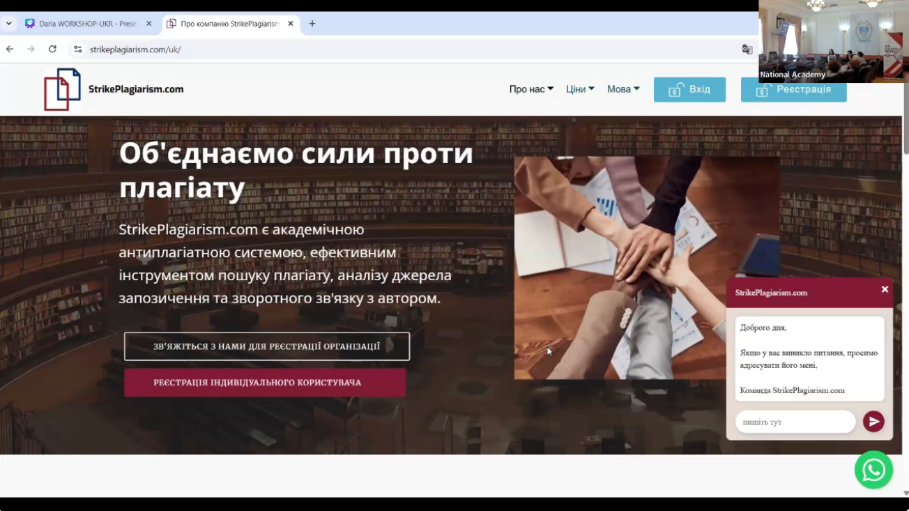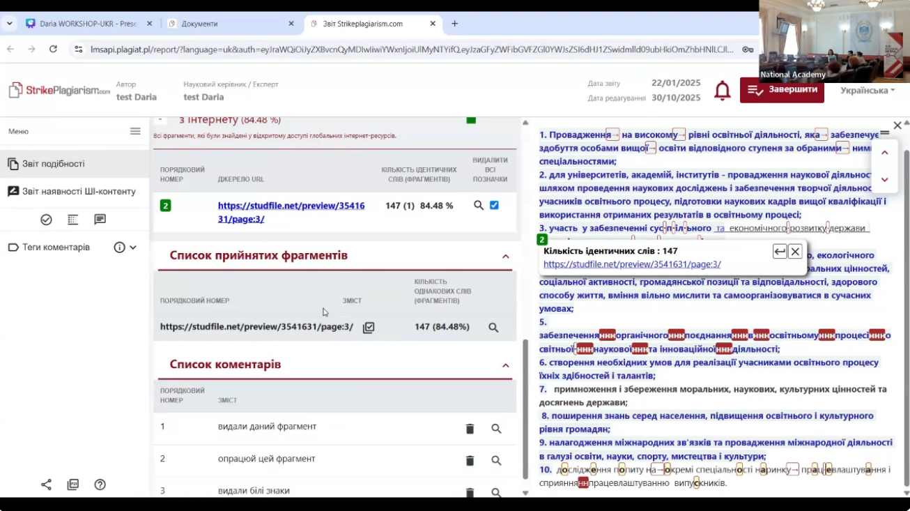 20) 12 листопада 2025 року в Глухівському національному педагогічному університеті імені Олександра Довженка відбувся онлайн-воркшоп "Новації у програмі StrikePlagiarism: нові можливості для перевірки робіт на плагіат у 2025 році". Спікеркою заходу виступила менеджерка з розвитку StrikePlagiarism в Україні Анна Чудак, яку за ініціативи бібліотеки університету було запрошено поділитися новітніми можливостями сервісу з нашою академічною спільнотою. Під час воркшопу учасникам було представлено розширення функціоналу звіту подібності та режиму коментування. Окремим блоком було розглянуто модуль виявлення використання генеративного ШІ, його алгоритми та рекомендації щодо того, як правильно інтерпретувати такі результати в освітньому процесі. Особливу увагу також приділили аналізу звіту подібності та прийняттю рішень щодо коректності використаних джерел. Бібліотека Глухівського національного педагогічного університету імені Олександра Довженка щиро дякує пані Анні Чудак за фаховість, відкритість і готовність ділитися практичними інструментами роботи зі звітами подібності. Ми й надалі продовжуватимемо зміцнювати культуру академічної доброчесності та підтримувати викладачів у їхній щоденній важкій роботі.