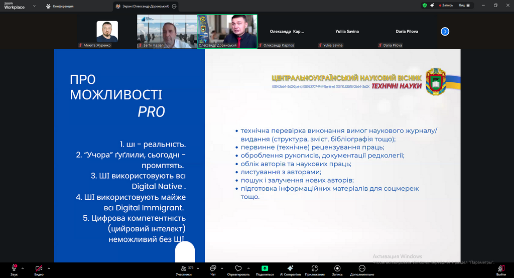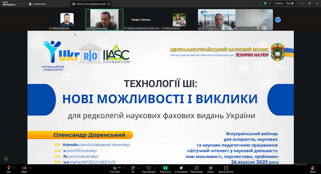 15) 26 вересня 2025 року аспіранти, педагогічні та науково-педагогічні працівники Глухівського національного педагогічного університету імені Олександра Довженка взяли участь у Всеукраїнському вебінарі "Штучний інтелект в науковій діяльності: нові можливості, перспективи, проблеми", організованому Університетом митної справи та фінансів спільно з Українським офісом дослідницької доброчесності (UkrRIO), ГО «Інноваційний університет», Центральноукраїнським національним технічним університетом, Національним технічним університетом «Дніпровська політехніка» та ТОВ «ПЛАГІАТ» (StrikePlagiarism). Захід було присвячено обговоренню сучасних тенденцій використання технологій штучного інтелекту у науковій діяльності, їх впливу на академічну доброчесність, етичні аспекти досліджень та майбутнє освіти в умовах цифровізації. Учасники вебінару долучилися до жвавої дискусії, під час якої обговорювалися як перспективи впровадження інтелектуальних технологій, так і виклики, пов’язані з дотриманням принципів етики, авторства та наукової відповідальності. Представники університету відзначили, що участь у заході сприяла розширенню їхнього наукового світогляду, підвищенню обізнаності щодо сучасних цифрових інструментів та формуванню усвідомленого ставлення до використання штучного інтелекту у дослідницькій практиці.