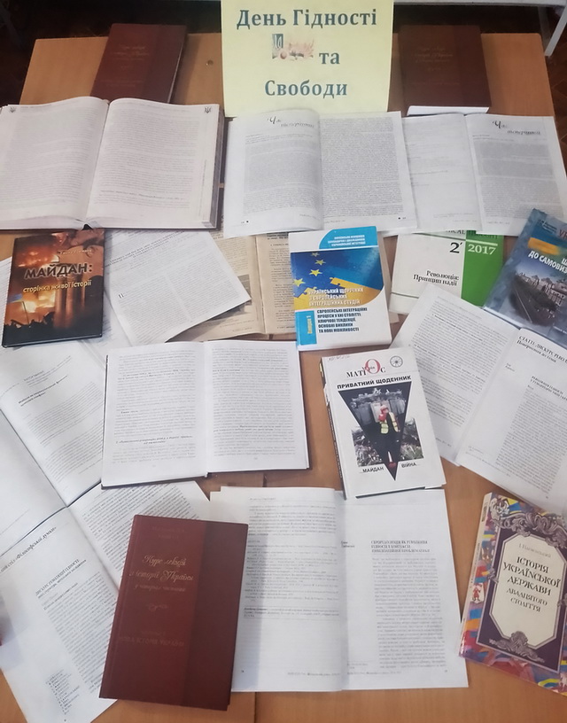 ㅤㅤДень Гідності та Свободи ‒ це символ незламності українського народу, його прагнення до демократії, свободи та національної гідності. У цей день ми вшановуємо події, що стали поворотними для сучасної історії України, а також віддаємо шану громадянській мужності, самопожертві та єдності, проявленим під час Помаранчевої революції та Революції Гідності. ㅤㅤБібліотека Глухівського національного педагогічного університету імені Олександра Довженка долучається до загальнонаціонального вшанування, презентуючи тематичну книжкову виставку "День Гідності та Свободи". Експозиція висвітлює ключові події, причини та наслідки громадянських протестів, а також ролі особистості й суспільства у становленні демократичних цінностей. ㅤㅤМетою виставки є не лише популяризація історико-документальної спадщини, а й формування критичного осмислення подій новітньої історії України серед здобувачів освіти та академічної спільноти. Пам’ятаймо: гідність і свобода ‒ це цінності, що потребують щоденного утвердження. |