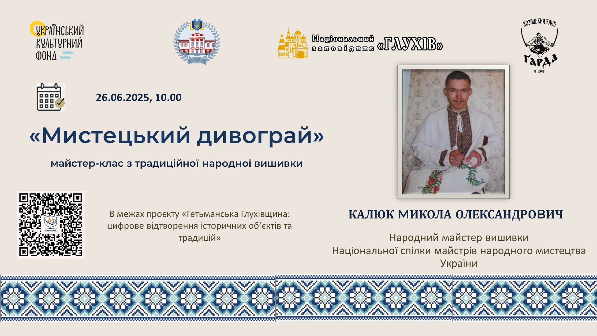 ㅤㅤОбидва заходи проведе Калюк Микола Олександрович – народний майстер вишивки, член Національної спілки майстрів народного мистецтва України, поет, журналіст, краєзнавець, відомий своєю творчою діяльністю у сфері збереження культурної спадщини. Запрошуємо до співтворчості, занурення в автентичну атмосферу українського мистецтва та пізнання глибокого сенсу народної традиції.